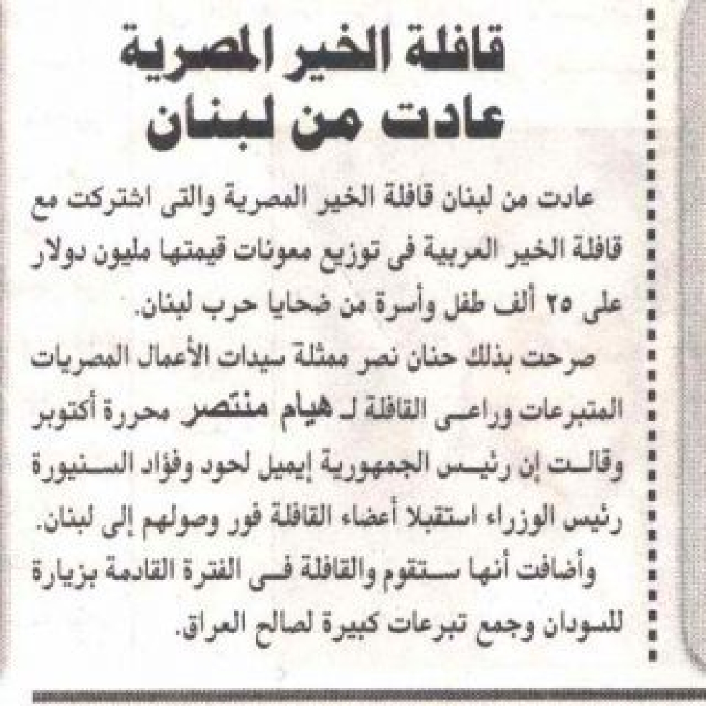 قامت المؤسسة بتنظيم الزيارة، بالتعاون مع جمعية رامي عياش (طفولة عياش)، وبدعوة من عائلة السراج المغربية. كما زار الوفد الأطفال المصابين بالسرطان في المستشفى الجامعي بالدار البيضاء، حيث تبنت نادين فهد أحد الأطفال لعلاجه على نفقتها الخاصة، وقام نادي الفنانين المغاربة بالرباط، برئاسة الفنان الكبير عبد العالي الغاوي، بتكريم "حنان ونادين"، وسط حفاوة كبيرة تعكس حب المغاربة الشديد لجميع العرب. كما تمت زيارة 12 مدينة مغربية.