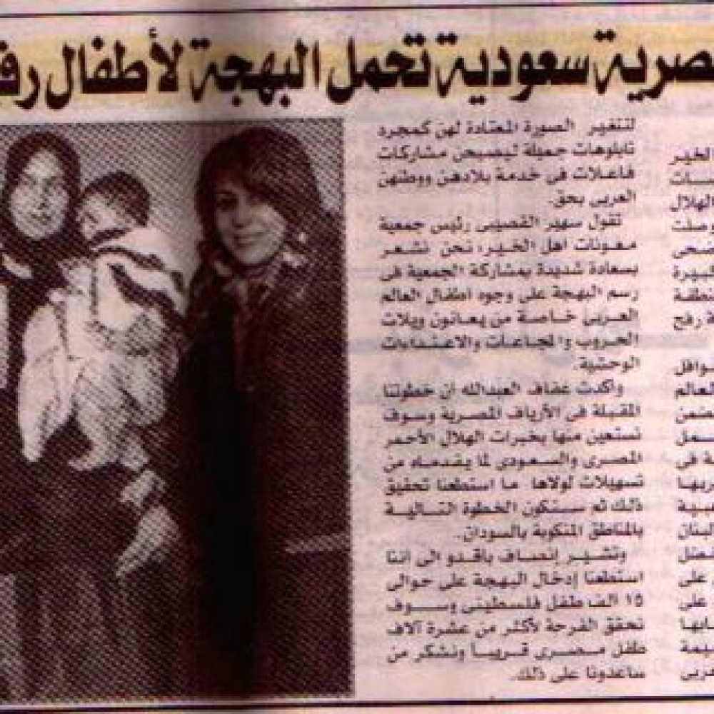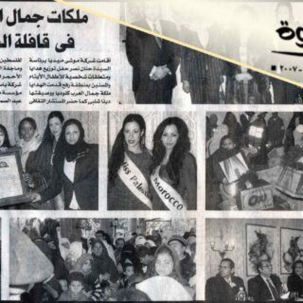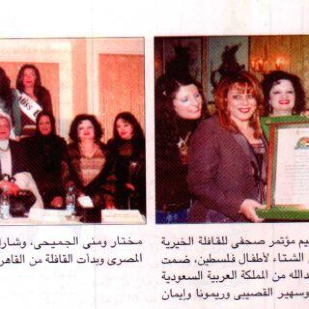 قامت مؤسسة ملكات جمال العرب بالتعاون مع الشيخة إنصاف أحمد باجيدو والسيدة عفاف مشهور العبد الله، ممثلتي شركة ياكستون والقافلة العربية الخيرية، وبالتعاون مع الهلال الأحمر المصري، بتنفيذ حملة القافلة العربية للخير لأطفال فلسطين في رفح لإدخال البهجة على الفلسطينيين بجوار معبر رفح المصري.. وحضر المؤتمر الصحفي هند عاكف، وغازي فخري القنصل الفلسطيني، وملكة جمال مصر دينا شلبي، وملكة جمال المغرب إيمان الباني، وملكة جمال فلسطين منية محتسب، وماجدة الشربيني رئيسة الهلال الأحمر المصري، وسهير القصبي وريتا بدر الدين.